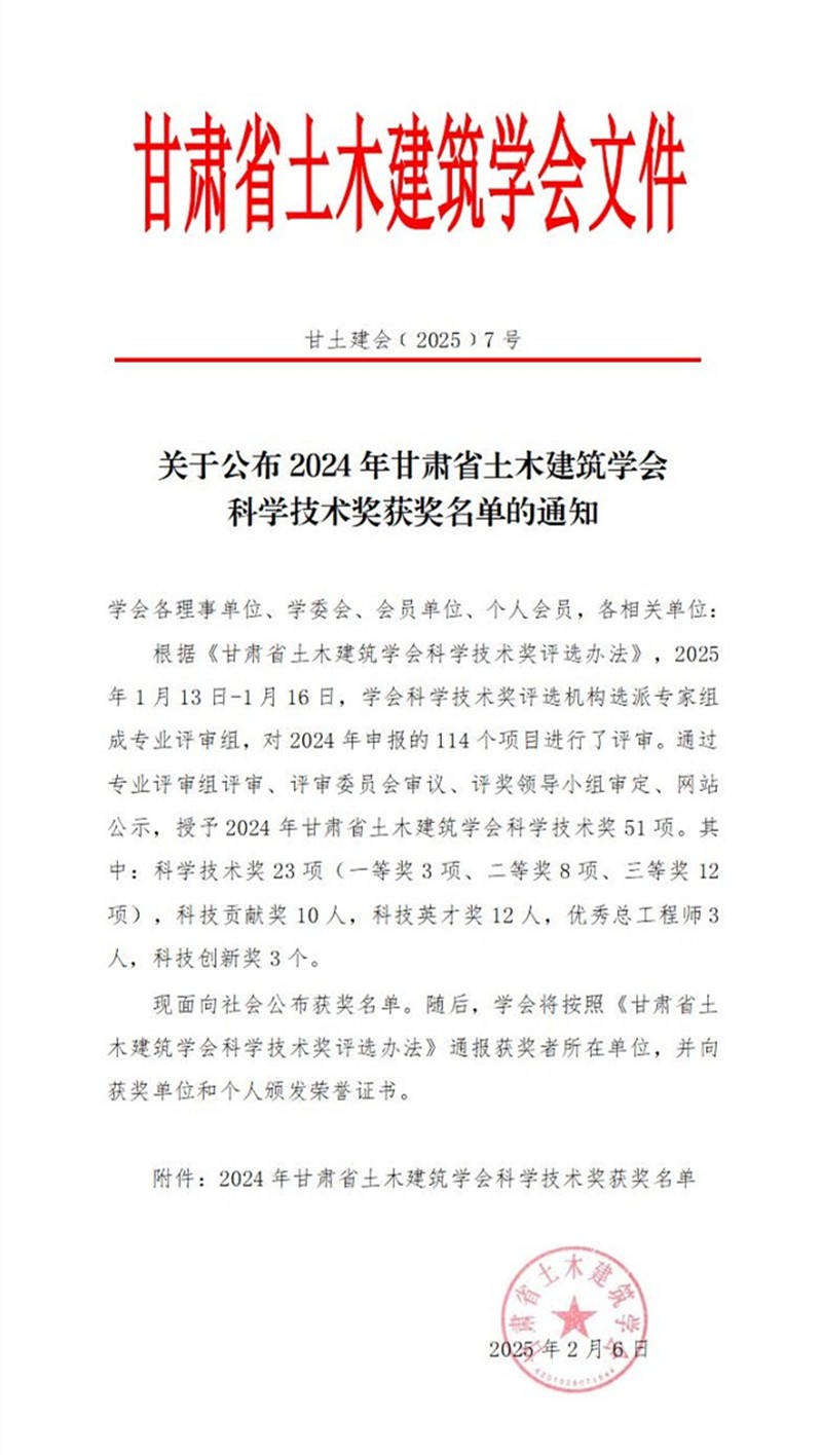 近日,2024年甘肅省土木建筑學會科學技術獎獲獎結果公布,甘肅工程咨詢集團斬獲多項榮譽。其中,省建筑設計院申報的《咬合樁技術在深大基坑中的創新與應用》項目榮獲“科學技術獎(勘測科研組)二等獎”,省城鄉規劃院申報的《城市區域地震災害模擬及規劃研發平臺建設》項目榮獲“科學技術獎(綜合組)二等獎”,土木工程院參與的《寒區水工混凝土抗沖磨技術的開發與應用》項目榮獲“科學技術獎(勘測科研組)三等獎”。省建筑設計院、省城鄉規劃院4人分別榮獲“科技貢獻獎”“科技英才獎”“科技貢獻獎”“優秀總工程師獎”等榮譽稱號。