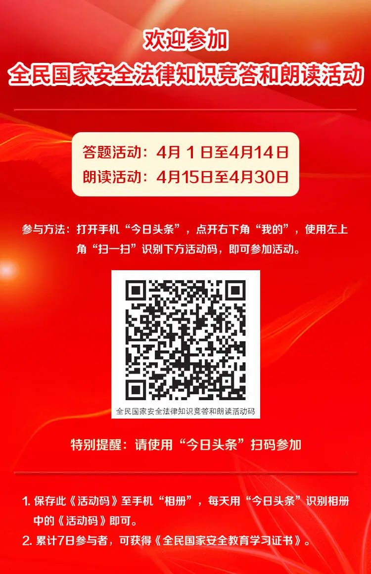 今年是國家安全法頒布施行10周年,4月15日是第十個(gè)全民國家安全教育日。為深入貫徹落實(shí)習(xí)近平總書記關(guān)于全面加強(qiáng)國家安全教育的重要指示批示精神,推進(jìn)國家安全法治宣傳教育走深走實(shí),增強(qiáng)全民國家安全意識(shí)和法治意識(shí),倡議大家參加全民國家安全法律知識(shí)競答和朗讀活動(dòng)。