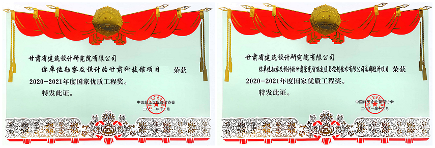 日前,從中國施工企業管理協會傳來喜訊,由甘肅省建筑設計研究院有限公司勘察及設計的“甘肅科技館項目”和“甘肅紫光智能交通與控制技術有限公司總部經濟項目”榮獲2020—2021年度國家優質工程獎。