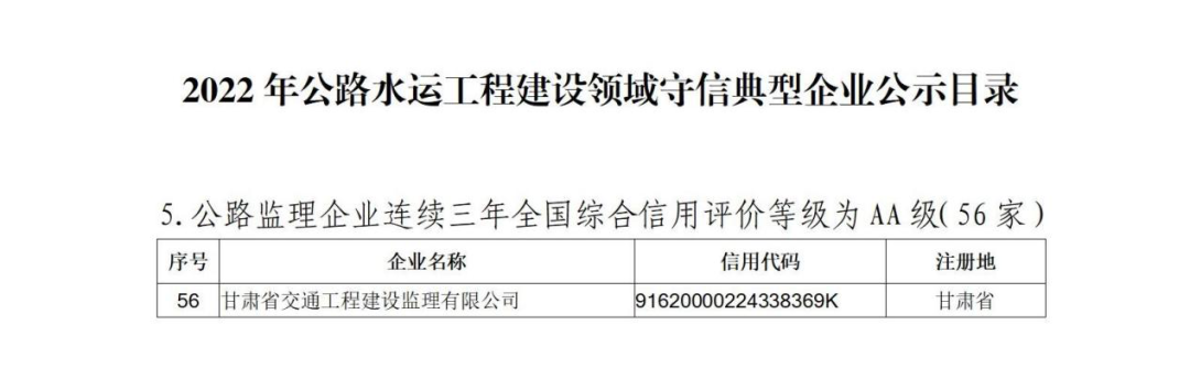近日,交通運(yùn)輸部公布了《關(guān)于2022年公路水運(yùn)工程建設(shè)領(lǐng)域守信典型企業(yè)目錄的公示》對獲評公路水運(yùn)工程建設(shè)領(lǐng)域守信典型的93家設(shè)計(jì)企業(yè)、93家施工企業(yè)、56家監(jiān)理企業(yè)予以公示。甘肅省6家企業(yè)榜上有名,甘肅省交通工程建設(shè)監(jiān)理有限公司是我省唯一一家上榜的監(jiān)理企業(yè)。