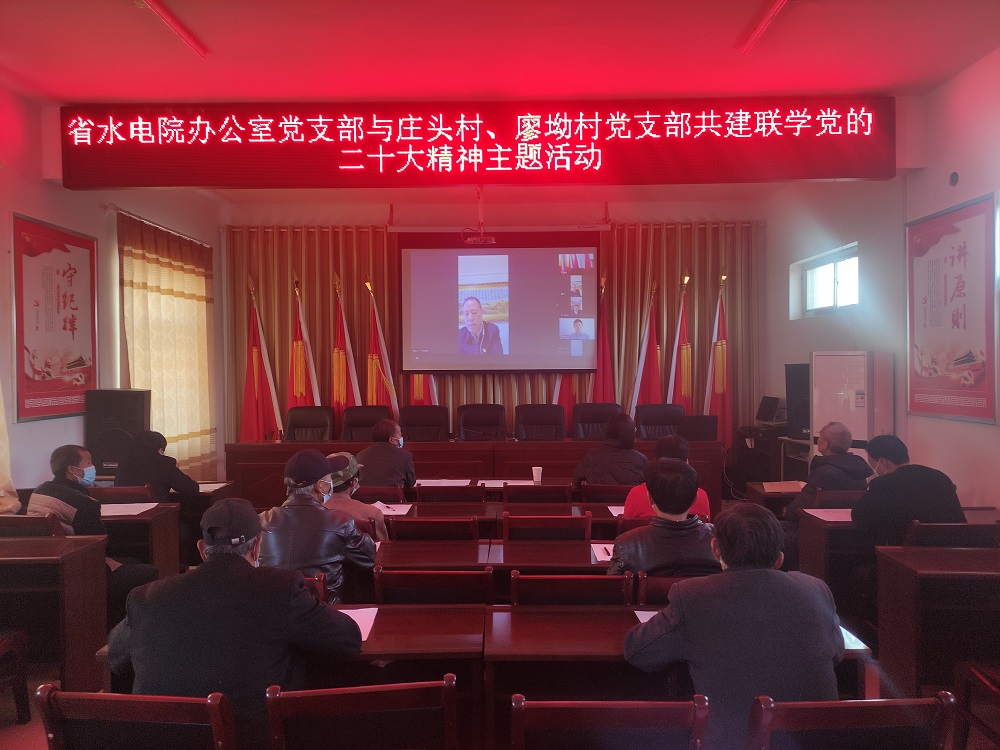會議以視頻形式召開,兩個幫扶村在線下設分會場,村黨支部成員在分會場參加。會上,水電設計院辦公室黨支部書記陳紅寶對黨的二十大精神進行了輔導宣講,辦公室黨支部、幫扶工作聯系人、駐村干部和兩個村黨支部書記、村民黨員代表等9人作了交流發言。